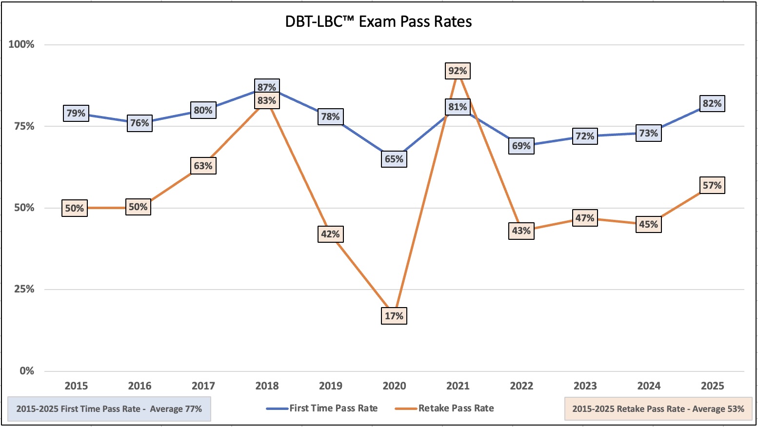 If you do not pass your first attempt at the exam, you are allowed to re-take the exam within four to twelve months after you have been unsuccessful. You will be eligible for the next available exam window that falls after four months have elapsed but not sooner. The only fee involved will be for the use of the Pearson Vue testing centers. There is no additional charge from DBT-LBC™ for the first retake within the 12 month period. If you do not pass your second attempt, we recommend you take at least 12 months for additional study and possible consultation with a DBT expert/certified clinician to help clarify any misunderstandings you may have of the materials. Due to the administrative tasks that will need to be provided for the third exam opportunity (or one taken after 12 months has elapsed), there will be an additional exam fee ($270) from DBT-LBC™ also. Your application will need to be updated before indicating an interest in re-taking the exam after 12 months. It will be reviewed and verified once more to assure the most recent professional status in good standing.